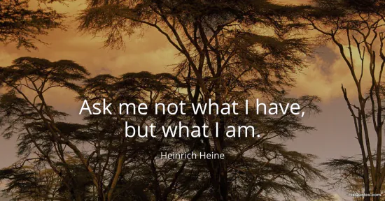 Heine, Heinrich. (2026, January 18). Ask me not what I have, but what I am. FixQuotes. https://fixquotes.com/quotes/ask-me-not-what-i-have-but-what-i-am-8034/