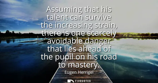 Herrigel opens with a deceptively calm conditional - "Assuming that his talent can survive" - and in that single phrase he punctures the cozy Western myth of mastery as steady ascent. Talent here is not a gift you simply possess; its survival is in question. The "increasing strain" suggests that improvement isn’t additive but erosive: every step toward refinement tightens the vise, raising the odds that ego, impatience, or sheer psychological fatigue will snap the student back into comfortable competence.