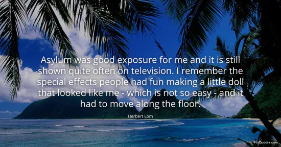 Lom, Herbert. "Asylum was good exposure for me and it is still shown quite often on television. I remember the special effects people had fun making a little doll that looked like me - which is not so easy - and it had to move along the floor." FixQuotes. January 16, 2026. https://fixquotes.com/quotes/asylum-was-good-exposure-for-me-and-it-is-still-124690/.