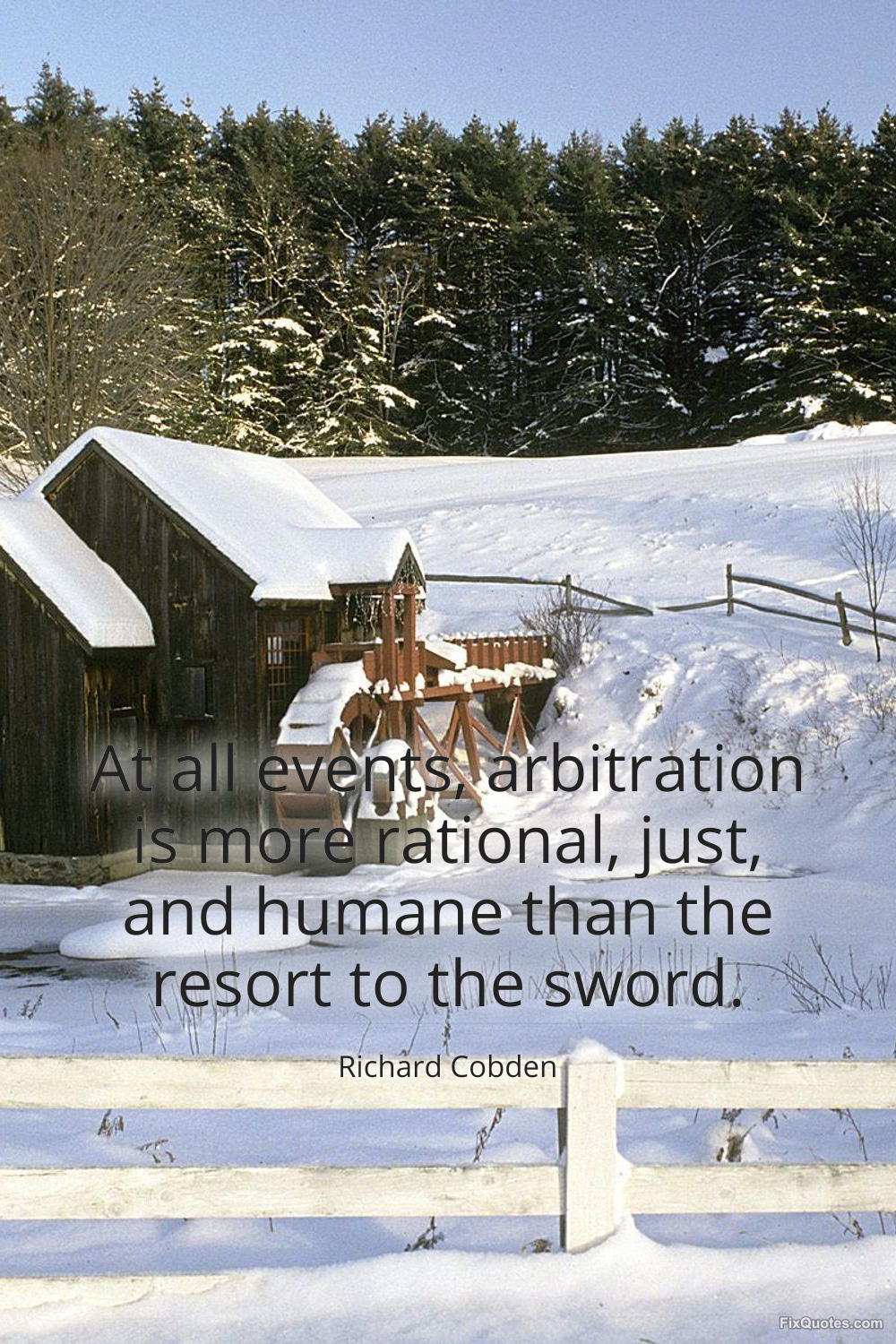 Cobden, Richard. (2026, January 18). At all events, arbitration is more rational, just, and humane than the resort to the sword. FixQuotes. https://fixquotes.com/quotes/at-all-events-arbitration-is-more-rational-just-9980/
