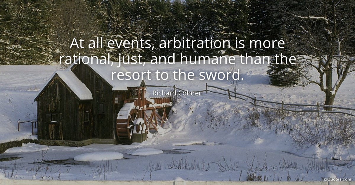 Cobden, Richard. "At all events, arbitration is more rational, just, and humane than the resort to the sword." FixQuotes. January 18, 2026. https://fixquotes.com/quotes/at-all-events-arbitration-is-more-rational-just-9980/.