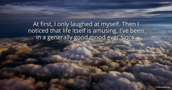 Savant, Marilyn vos. "At first, I only laughed at myself. Then I noticed that life itself is amusing. I've been in a generally good mood ever since." FixQuotes. January 17, 2026. https://fixquotes.com/quotes/at-first-i-only-laughed-at-myself-then-i-noticed-82109/.