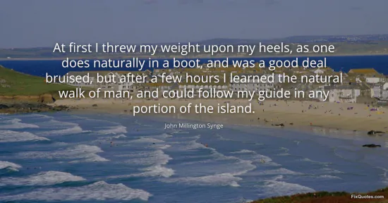 Synge, John Millington. (2026, January 18). At first I threw my weight upon my heels, as one does naturally in a boot, and was a good deal bruised, but after a few hours I learned the natural walk of man, and could follow my guide in any portion of the island. FixQuotes. https://fixquotes.com/quotes/at-first-i-threw-my-weight-upon-my-heels-as-one-11133/