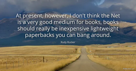 Rucker, Rudy. "At present, however, I don't think the Net is a very good medium for books, books should really be inexpensive lightweight paperbacks you can bang around." FixQuotes. January 16, 2026. https://fixquotes.com/quotes/at-present-however-i-dont-think-the-net-is-a-very-95010/.