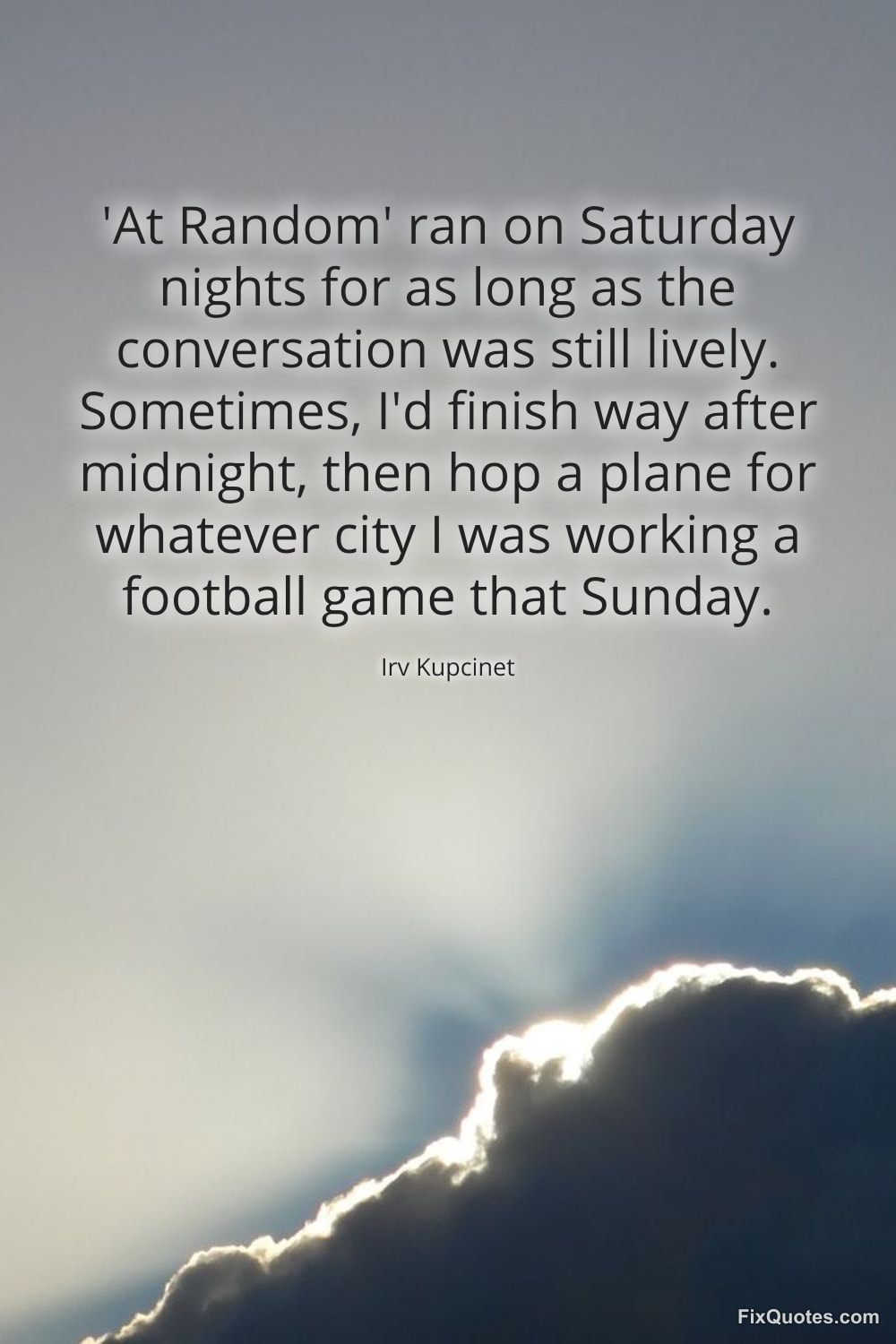 Kupcinet, Irv. (2026, January 15). 'At Random' ran on Saturday nights for as long as the conversation was still lively. Sometimes, I'd finish way after midnight, then hop a plane for whatever city I was working a football game that Sunday. FixQuotes. https://fixquotes.com/quotes/at-random-ran-on-saturday-nights-for-as-long-as-173572/