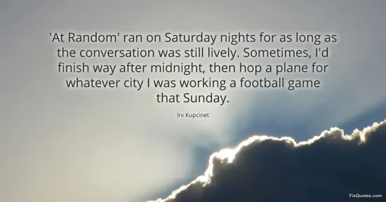 Kupcinet, Irv. "'At Random' ran on Saturday nights for as long as the conversation was still lively. Sometimes, I'd finish way after midnight, then hop a plane for whatever city I was working a football game that Sunday." FixQuotes. January 15, 2026. https://fixquotes.com/quotes/at-random-ran-on-saturday-nights-for-as-long-as-173572/.