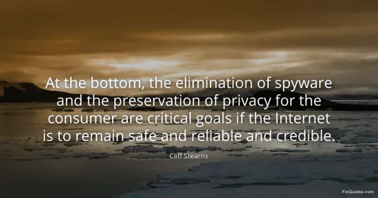 Stearns, Cliff. "At the bottom, the elimination of spyware and the preservation of privacy for the consumer are critical goals if the Internet is to remain safe and reliable and credible." FixQuotes. January 17, 2026. https://fixquotes.com/quotes/at-the-bottom-the-elimination-of-spyware-and-the-42264/.