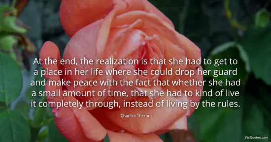 Theron, Charlize. "At the end, the realization is that she had to get to a place in her life where she could drop her guard and make peace with the fact that whether she had a small amount of time, that she had to kind of live it completely through, instead of living by the rules." FixQuotes. January 17, 2026. https://fixquotes.com/quotes/at-the-end-the-realization-is-that-she-had-to-get-59891/.