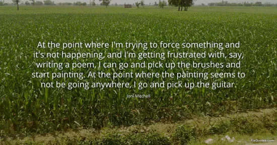Mitchell, Joni. (2026, January 16). At the point where I'm trying to force something and it's not happening, and I'm getting frustrated with, say, writing a poem, I can go and pick up the brushes and start painting. At the point where the painting seems to not be going anywhere, I go and pick up the guitar. FixQuotes. https://fixquotes.com/quotes/at-the-point-where-im-trying-to-force-something-98830/