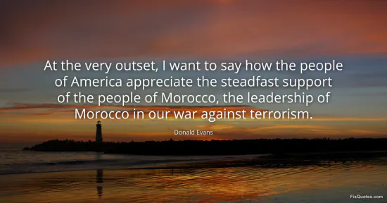 Evans, Donald. (2026, February 18). At the very outset, I want to say how the people of America appreciate the steadfast support of the people of Morocco, the leadership of Morocco in our war against terrorism. FixQuotes. https://fixquotes.com/quotes/at-the-very-outset-i-want-to-say-how-the-people-57234/