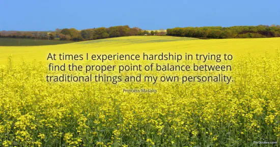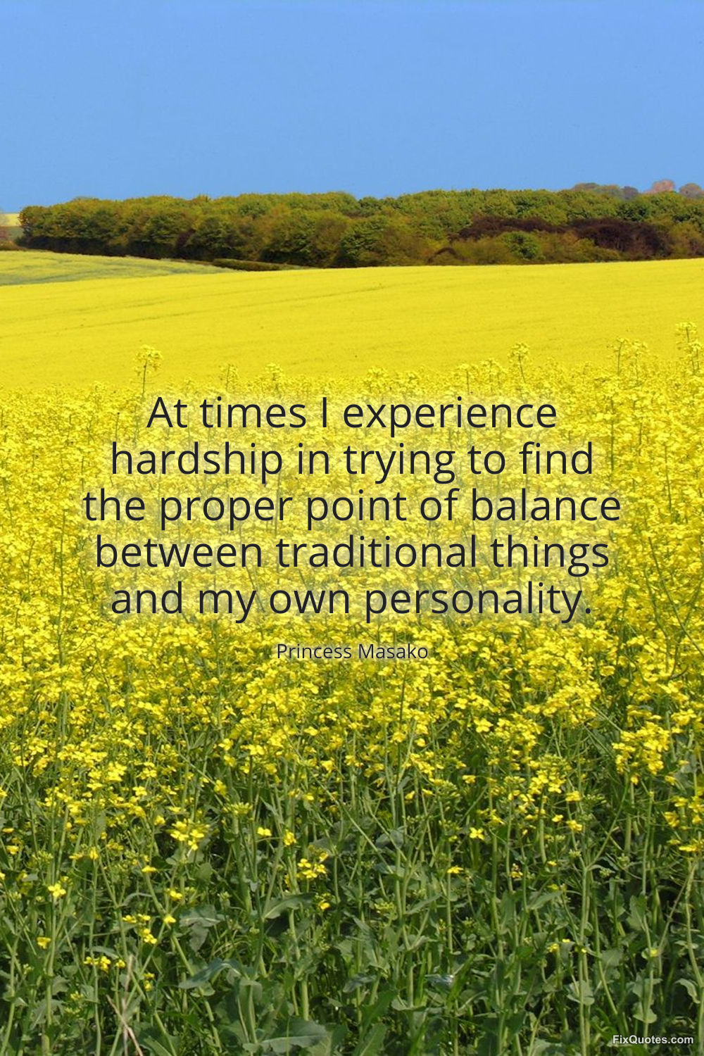 Masako, Princess. "At times I experience hardship in trying to find the proper point of balance between traditional things and my own personality." FixQuotes. January 16, 2026. https://fixquotes.com/quotes/at-times-i-experience-hardship-in-trying-to-find-106524/.