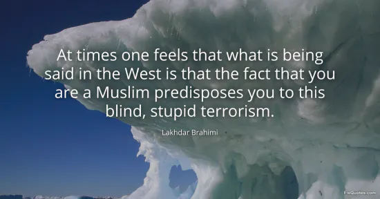 Brahimi, Lakhdar. (2026, January 16). At times one feels that what is being said in the West is that the fact that you are a Muslim predisposes you to this blind, stupid terrorism. FixQuotes. https://fixquotes.com/quotes/at-times-one-feels-that-what-is-being-said-in-the-96634/