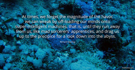 Dooling, Richard. "At times, we forget the magnitude of the havoc we can wreak by off-loading our minds onto super-intelligent machines, that is, until they run away from us, like mad sorcerers' apprentices, and drag us up to the precipice for a look down into the abyss." FixQuotes. January 15, 2026. https://fixquotes.com/quotes/at-times-we-forget-the-magnitude-of-the-havoc-we-153094/.