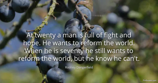 Dangerfield, Rodney. "At twenty a man is full of fight and hope. He wants to reform the world. When he is seventy he still wants to reform the world, but he know he can't." FixQuotes. January 18, 2026. https://fixquotes.com/quotes/at-twenty-a-man-is-full-of-fight-and-hope-he-1583/.