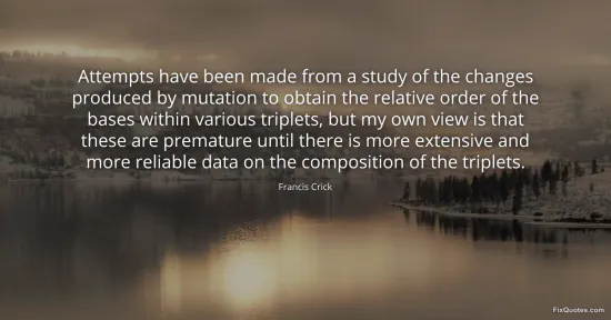 Crick, Francis. "Attempts have been made from a study of the changes produced by mutation to obtain the relative order of the bases within various triplets, but my own view is that these are premature until there is more extensive and more reliable data on the composition of the triplets." FixQuotes. January 18, 2026. https://fixquotes.com/quotes/attempts-have-been-made-from-a-study-of-the-5506/.