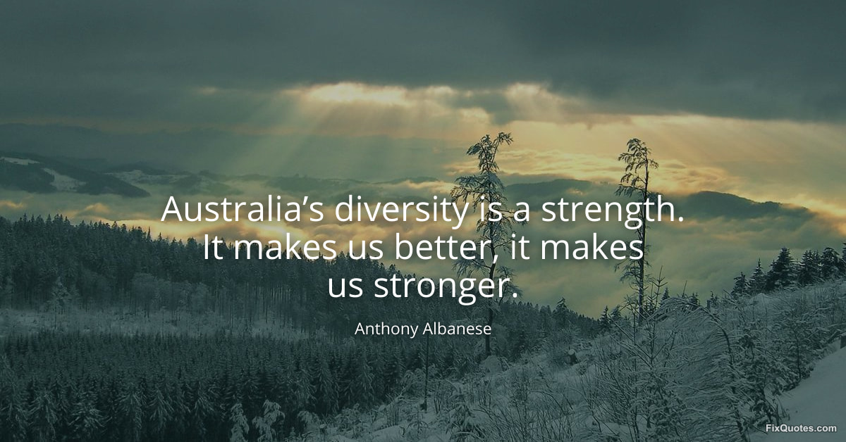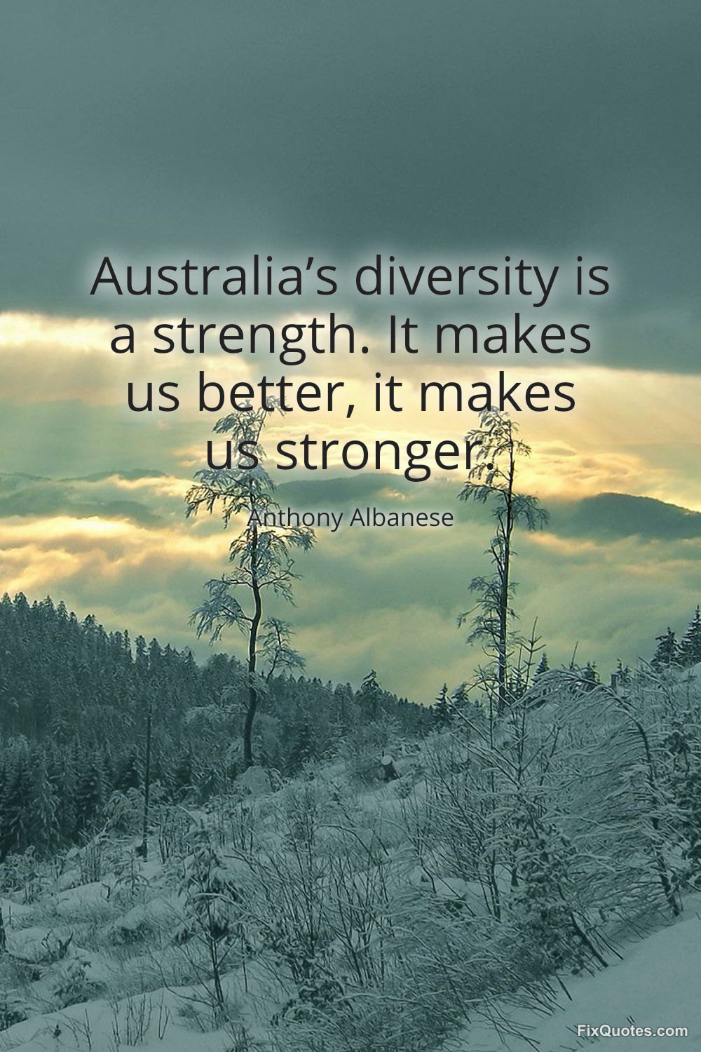 Albanese, Anthony. (2026, January 26). Australia’s diversity is a strength. It makes us better, it makes us stronger. FixQuotes. https://fixquotes.com/quotes/australias-diversity-is-a-strength-it-makes-us-184627/