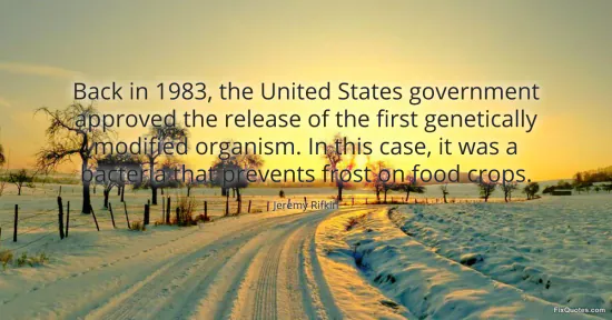 Rifkin, Jeremy. (2026, January 18). Back in 1983, the United States government approved the release of the first genetically modified organism. In this case, it was a bacteria that prevents frost on food crops. FixQuotes. https://fixquotes.com/quotes/back-in-1983-the-united-states-government-3055/