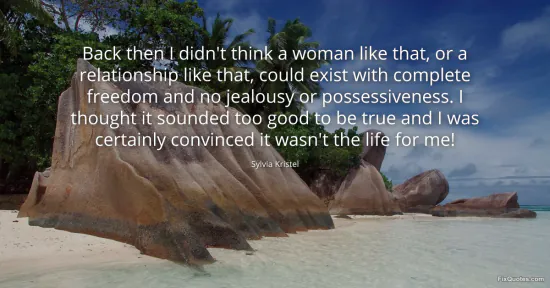 Kristel, Sylvia. "Back then I didn't think a woman like that, or a relationship like that, could exist with complete freedom and no jealousy or possessiveness. I thought it sounded too good to be true and I was certainly convinced it wasn't the life for me!" FixQuotes. January 15, 2026. https://fixquotes.com/quotes/back-then-i-didnt-think-a-woman-like-that-or-a-165872/.