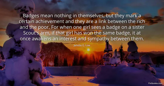 Low, Juliette G. (2026, January 16). Badges mean nothing in themselves, but they mark a certain achievement and they are a link between the rich and the poor. For when one girl sees a badge on a sister Scout's arm, if that girl has won the same badge, it at once awakens an interest and sympathy between them. FixQuotes. https://fixquotes.com/quotes/badges-mean-nothing-in-themselves-but-they-mark-a-136608/