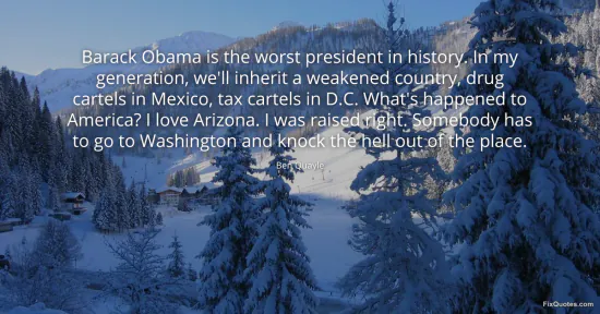 "Barack Obama is the worst president in history. In my generation, we'll inherit a weakened country, drug cartels in Mexico, tax cartels in D.C. What's happened to America? I love Arizona. I was raised right. Somebody has to go to Washington and knock the hell out of the place." FixQuotes, 16 Jan. 2026, https://fixquotes.com/quotes/barack-obama-is-the-worst-president-in-history-in-138556/. Accessed 13 Feb. 2026.