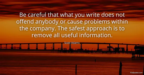 Adams, Scott. "Be careful that what you write does not offend anybody or cause problems within the company. The safest approach is to remove all useful information." FixQuotes. January 18, 2026. https://fixquotes.com/quotes/be-careful-that-what-you-write-does-not-offend-15397/.