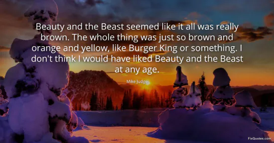 Judge, Mike. "Beauty and the Beast seemed like it all was really brown. The whole thing was just so brown and orange and yellow, like Burger King or something. I don't think I would have liked Beauty and the Beast at any age." FixQuotes. January 16, 2026. https://fixquotes.com/quotes/beauty-and-the-beast-seemed-like-it-all-was-134210/.
