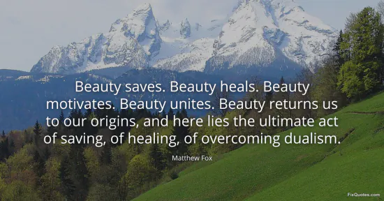 Fox, Matthew. (2026, January 16). Beauty saves. Beauty heals. Beauty motivates. Beauty unites. Beauty returns us to our origins, and here lies the ultimate act of saving, of healing, of overcoming dualism. FixQuotes. https://fixquotes.com/quotes/beauty-saves-beauty-heals-beauty-motivates-beauty-104421/