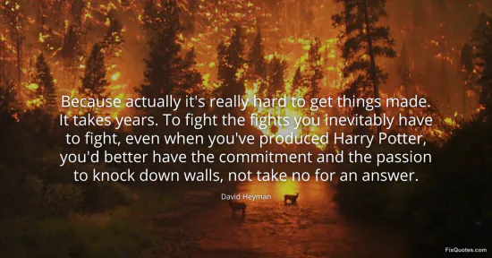 Heyman, David. (2026, January 17). Because actually it's really hard to get things made. It takes years. To fight the fights you inevitably have to fight, even when you've produced Harry Potter, you'd better have the commitment and the passion to knock down walls, not take no for an answer. FixQuotes. https://fixquotes.com/quotes/because-actually-its-really-hard-to-get-things-47653/