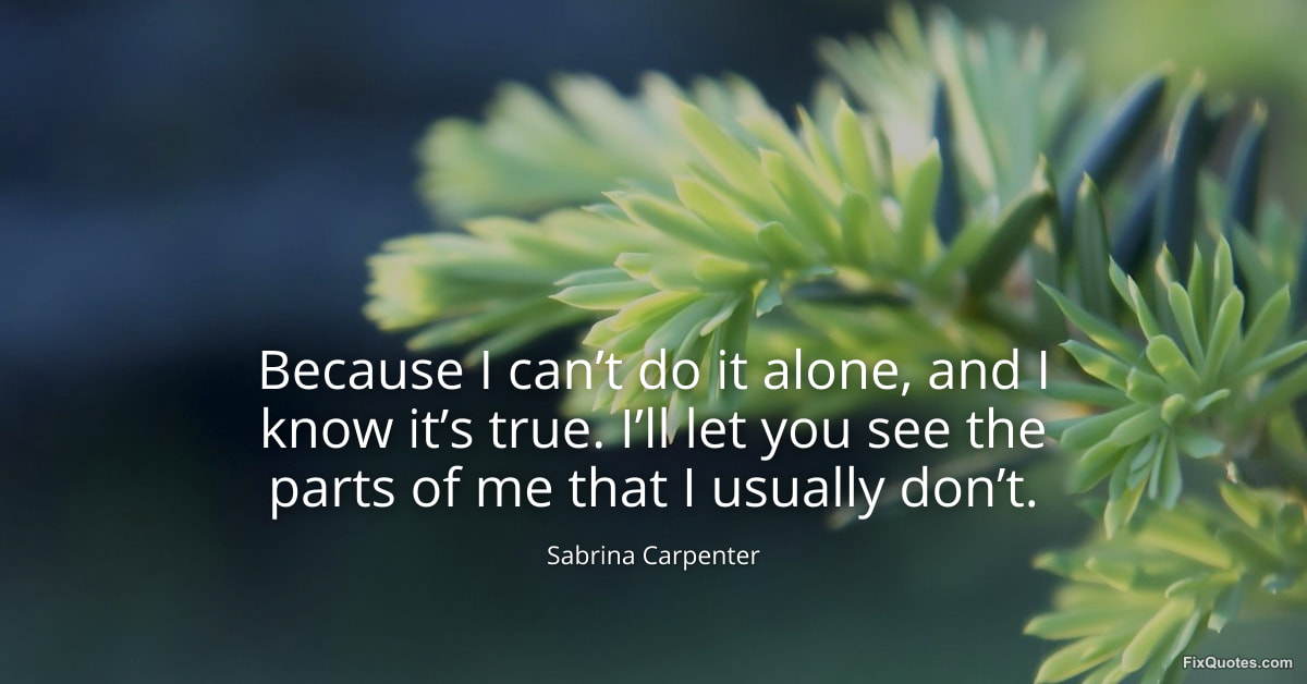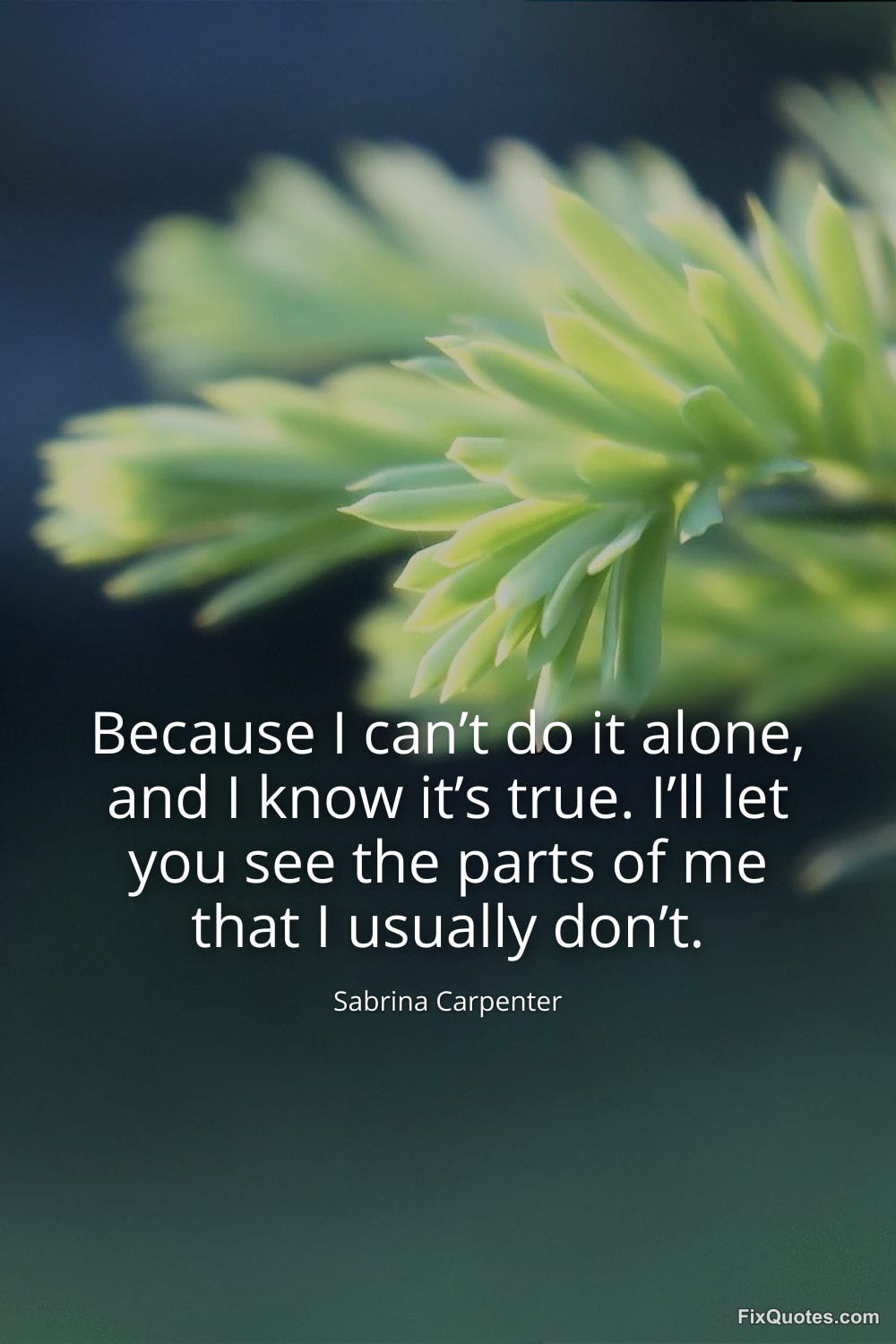 Carpenter, Sabrina. "Because I can’t do it alone, and I know it’s true. I’ll let you see the parts of me that I usually don’t." FixQuotes. January 26, 2026. https://fixquotes.com/quotes/because-i-cant-do-it-alone-and-i-know-its-true-184541/.
