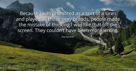 Gardner, Ava. "Because I was promoted as a sort of a siren and played all those sexy broads, people made the mistake of thinking I was like that off the screen. They couldn't have been more wrong." FixQuotes. January 17, 2026. https://fixquotes.com/quotes/because-i-was-promoted-as-a-sort-of-a-siren-and-40227/.