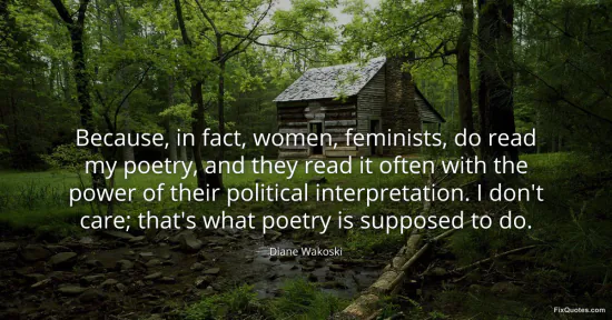 Wakoski, Diane. "Because, in fact, women, feminists, do read my poetry, and they read it often with the power of their political interpretation. I don't care; that's what poetry is supposed to do." FixQuotes. January 15, 2026. https://fixquotes.com/quotes/because-in-fact-women-feminists-do-read-my-poetry-148847/.