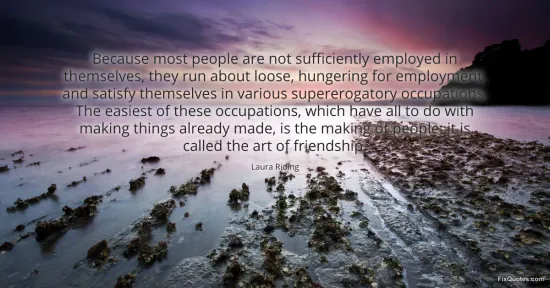 Riding, Laura. "Because most people are not sufficiently employed in themselves, they run about loose, hungering for employment, and satisfy themselves in various supererogatory occupations. The easiest of these occupations, which have all to do with making things already made, is the making of people: it is called the art of friendship." FixQuotes. January 16, 2026. https://fixquotes.com/quotes/because-most-people-are-not-sufficiently-employed-87088/.