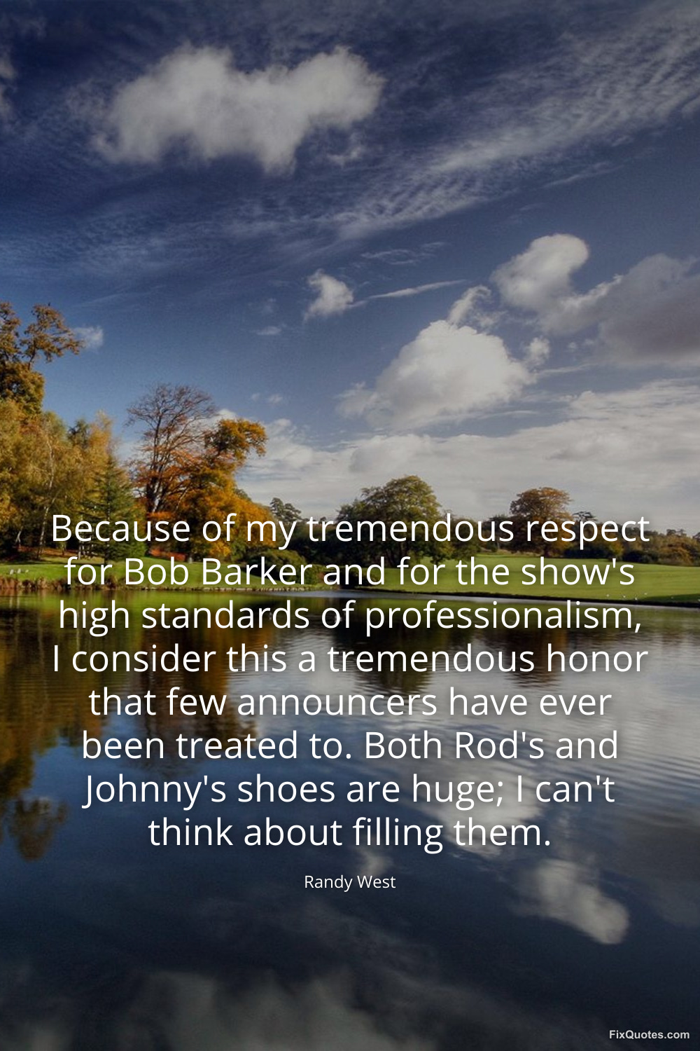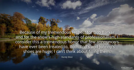 West, Randy. (2026, February 18). Because of my tremendous respect for Bob Barker and for the show's high standards of professionalism, I consider this a tremendous honor that few announcers have ever been treated to. Both Rod's and Johnny's shoes are huge; I can't think about filling them. FixQuotes. https://fixquotes.com/quotes/because-of-my-tremendous-respect-for-bob-barker-64255/