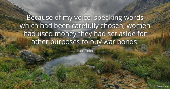 Smith, Kate. "Because of my voice, speaking words which had been carefully chosen, women had used money they had set aside for other purposes to buy war bonds." FixQuotes. January 16, 2026. https://fixquotes.com/quotes/because-of-my-voice-speaking-words-which-had-been-126387/.