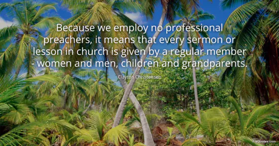 Christensen, Clayton. "Because we employ no professional preachers, it means that every sermon or lesson in church is given by a regular member - women and men, children and grandparents." FixQuotes. January 17, 2026. https://fixquotes.com/quotes/because-we-employ-no-professional-preachers-it-60192/.