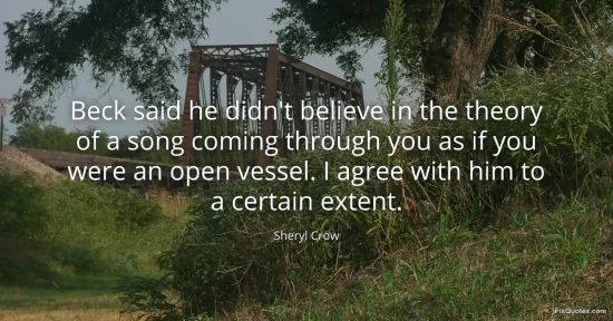 Crow, Sheryl. "Beck said he didn't believe in the theory of a song coming through you as if you were an open vessel. I agree with him to a certain extent." FixQuotes. January 15, 2026. https://fixquotes.com/quotes/beck-said-he-didnt-believe-in-the-theory-of-a-157283/.