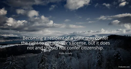 Schlafly, Phyllis. (2026, January 15). Becoming a resident of a state may confer the right to get a driver's license, but it does not and should not confer citizenship. FixQuotes. https://fixquotes.com/quotes/becoming-a-resident-of-a-state-may-confer-the-166484/