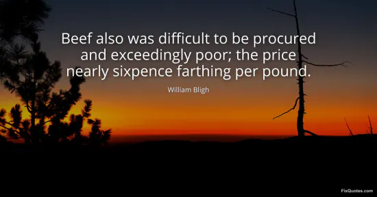 Bligh, William. "Beef also was difficult to be procured and exceedingly poor; the price nearly sixpence farthing per pound." FixQuotes. January 16, 2026. https://fixquotes.com/quotes/beef-also-was-difficult-to-be-procured-and-89951/.