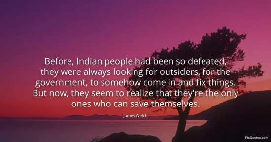 Welch, James. "Before, Indian people had been so defeated, they were always looking for outsiders, for the government, to somehow come in and fix things. But now, they seem to realize that they're the only ones who can save themselves." FixQuotes. January 15, 2026. https://fixquotes.com/quotes/before-indian-people-had-been-so-defeated-they-169465/.