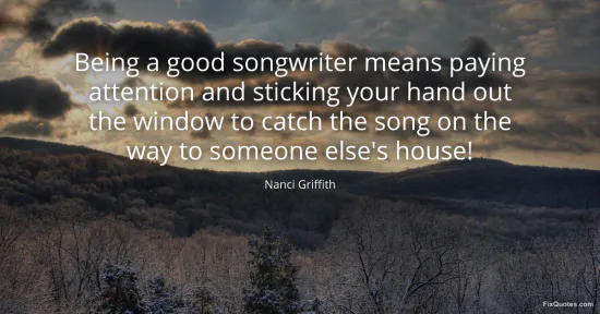 Griffith, Nanci. "Being a good songwriter means paying attention and sticking your hand out the window to catch the song on the way to someone else's house!" FixQuotes. January 17, 2026. https://fixquotes.com/quotes/being-a-good-songwriter-means-paying-attention-57611/.