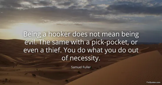 Fuller, Samuel. "Being a hooker does not mean being evil. The same with a pick-pocket, or even a thief. You do what you do out of necessity." FixQuotes. January 16, 2026. https://fixquotes.com/quotes/being-a-hooker-does-not-mean-being-evil-the-same-125293/.