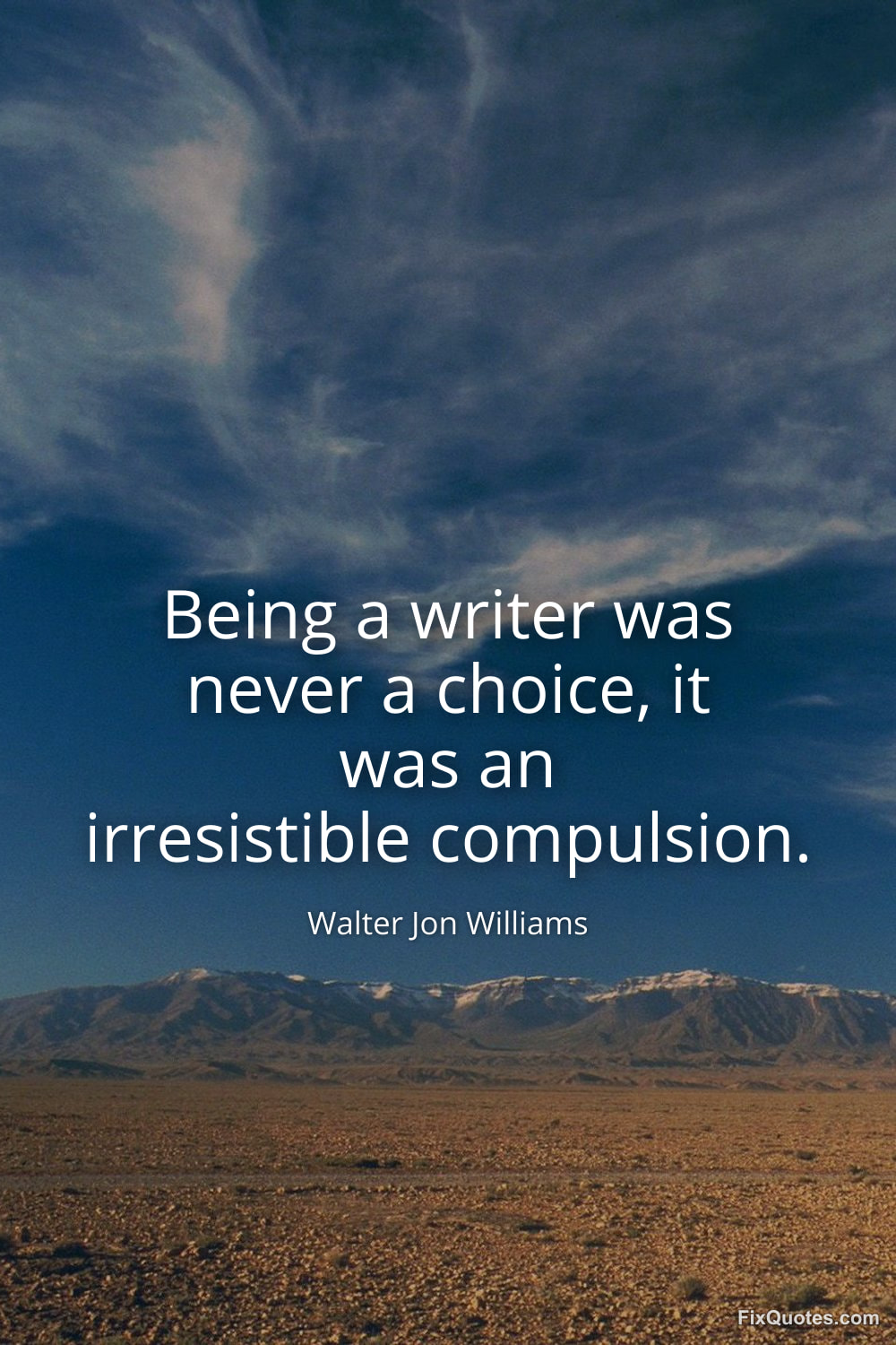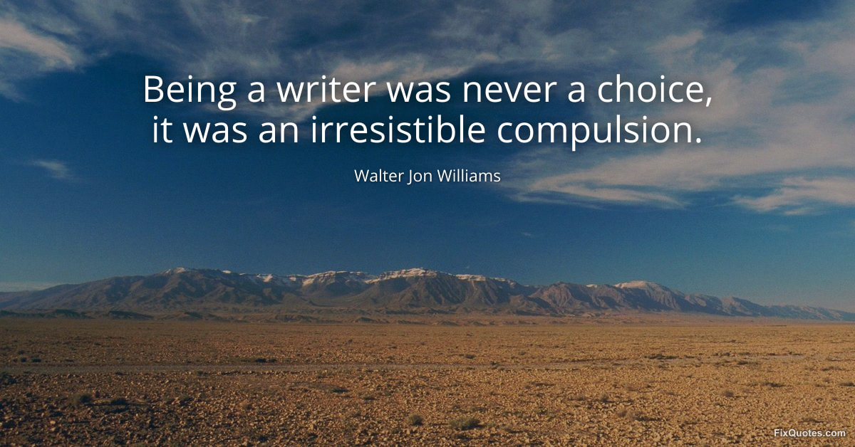Williams, Walter Jon. (2026, January 16). Being a writer was never a choice, it was an irresistible compulsion. FixQuotes. https://fixquotes.com/quotes/being-a-writer-was-never-a-choice-it-was-an-102875/