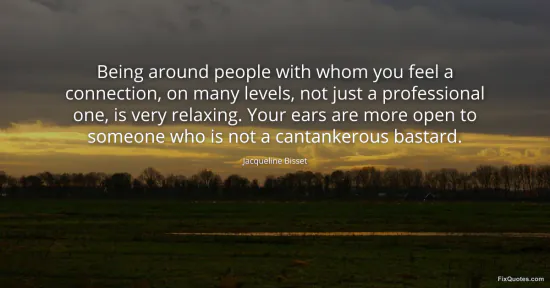 Bisset, Jacqueline. (2026, January 18). Being around people with whom you feel a connection, on many levels, not just a professional one, is very relaxing. Your ears are more open to someone who is not a cantankerous bastard. FixQuotes. https://fixquotes.com/quotes/being-around-people-with-whom-you-feel-a-23416/