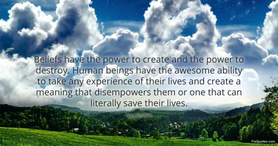 "Beliefs have the power to create and the power to destroy. Human beings have the awesome ability to take any experience of their lives and create a meaning that disempowers them or one that can literally save their lives." FixQuotes, 18 Jan. 2026, https://fixquotes.com/quotes/beliefs-have-the-power-to-create-and-the-power-to-22284/. Accessed 10 Feb. 2026.