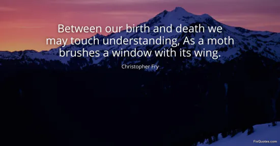 Fry, Christopher. "Between our birth and death we may touch understanding, As a moth brushes a window with its wing." FixQuotes. January 17, 2026. https://fixquotes.com/quotes/between-our-birth-and-death-we-may-touch-39147/.