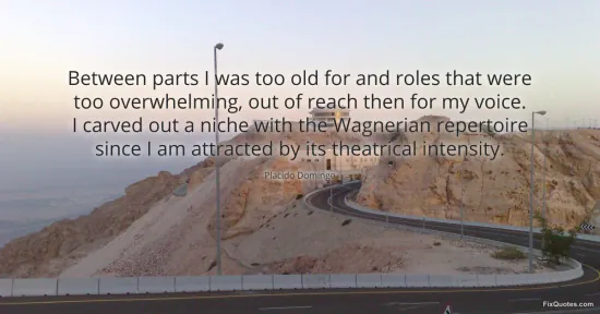 Domingo, Placido. (2026, January 16). Between parts I was too old for and roles that were too overwhelming, out of reach then for my voice. I carved out a niche with the Wagnerian repertoire since I am attracted by its theatrical intensity. FixQuotes. https://fixquotes.com/quotes/between-parts-i-was-too-old-for-and-roles-that-82816/