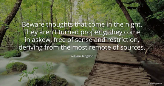 Trogdon, William. (2026, January 16). Beware thoughts that come in the night. They aren't turned properly; they come in askew, free of sense and restriction, deriving from the most remote of sources. FixQuotes. https://fixquotes.com/quotes/beware-thoughts-that-come-in-the-night-they-arent-90984/