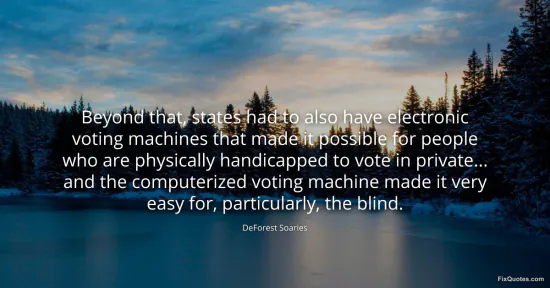 Soaries, DeForest. (2026, January 15). Beyond that, states had to also have electronic voting machines that made it possible for people who are physically handicapped to vote in private... and the computerized voting machine made it very easy for, particularly, the blind. FixQuotes. https://fixquotes.com/quotes/beyond-that-states-had-to-also-have-electronic-147622/