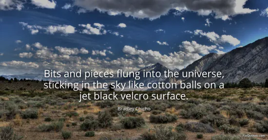 Chicho, Bradley. (2026, January 17). Bits and pieces flung into the universe, sticking in the sky like cotton balls on a jet black velcro surface. FixQuotes. https://fixquotes.com/quotes/bits-and-pieces-flung-into-the-universe-sticking-46284/