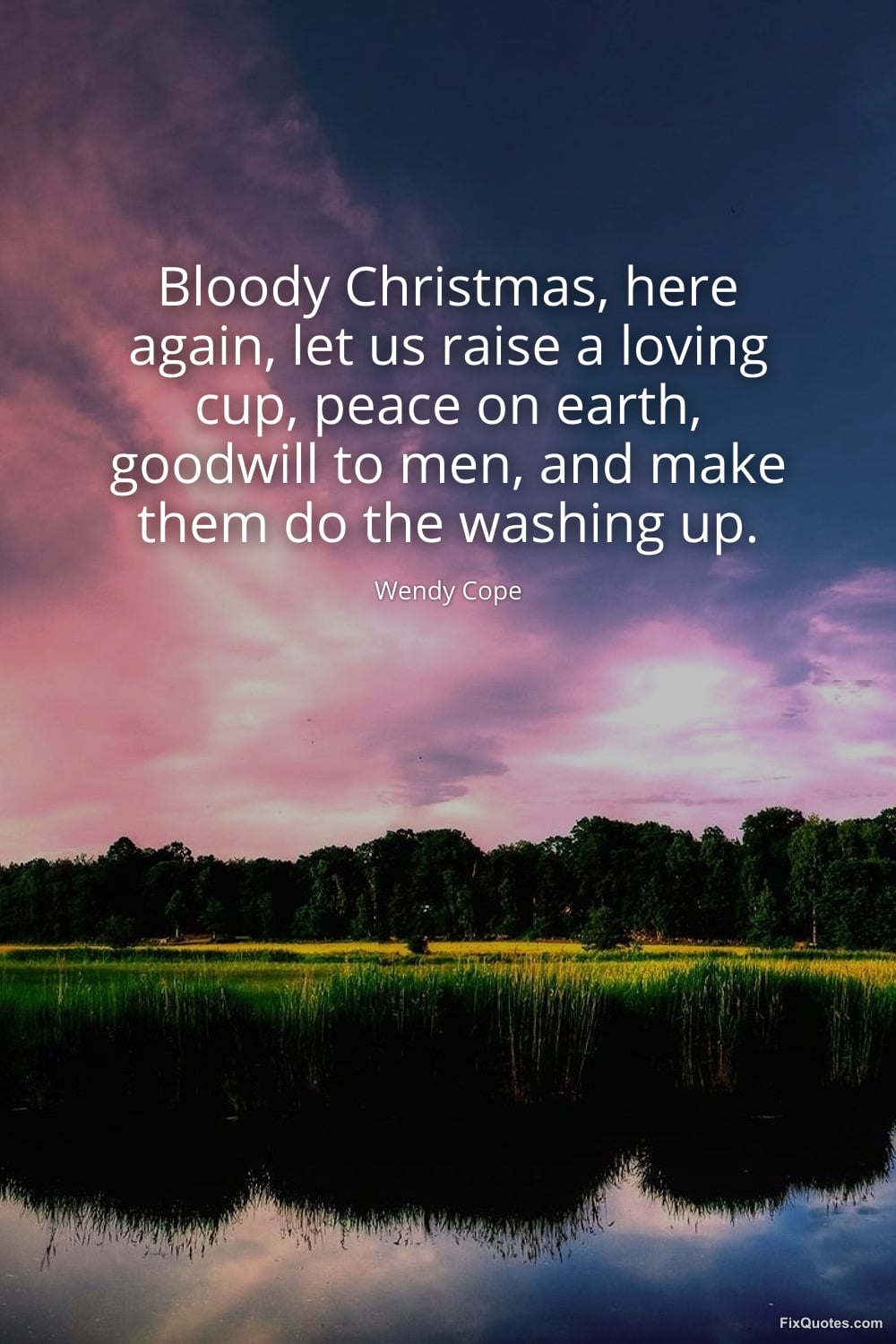 Cope, Wendy. (2026, January 16). Bloody Christmas, here again, let us raise a loving cup, peace on earth, goodwill to men, and make them do the washing up. FixQuotes. https://fixquotes.com/quotes/bloody-christmas-here-again-let-us-raise-a-loving-130247/